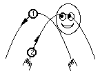 Two balls: almost juggling Now you are ready for two balls. Hold one ball in each hand. Throw one of the balls up and across the same as you just learned. When this first ball starts coming down, then throw the second ball up and across. Each ball should cross over to the opposite hand. Throw, throw, catch, catch. |